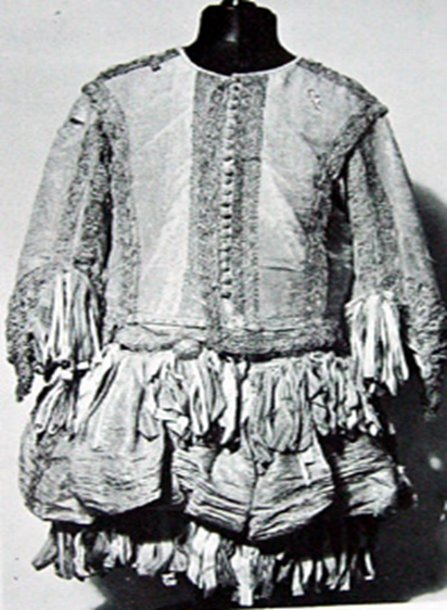 •여성의상은 앞의 스토마커에 정교한 자수를 놓은 흔적이 전시대에 남아있으며 스토마커 밑단에 달린 페플럼도 남아 있다. 후에 이 스토마커는 점점 작아지며 허리선이 높아졌는데 이것은 이 17세기동안 가장 빠르게 변화한 부분이다.