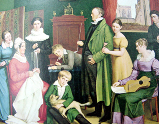 1848년 경의 가족그림. 아이는 보넷(모자)을 쓰고 털장식이 있는상의를 착용했는데 성인의 축소판임을 알 수 있다.