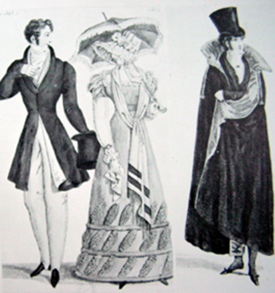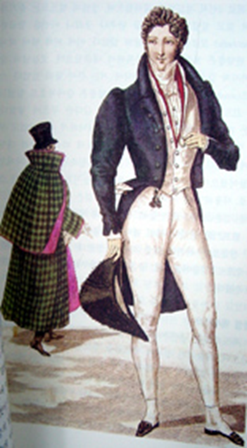왼쪽그림의 오른쪽 남성은 짙은 색의 프록코트와 몸에 달라붙는 바지를 착용했으며 시계줄과 시계를 넣는 작은 포켓이 달린 싱글 브레스트의 웨이스트 코트를 받쳐 입었으며 여행할 때에는 숄더 케이프가 달린 그레이트 코트를 입었다. 소매는 레그오브머튼(LEG OF MUTTON-양다리모양의 소매) 소매이며 소매부리가 좁다. 크라바트는 전 시대에 비해 간단해졌다.