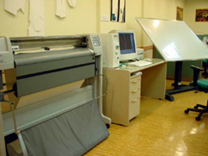 •오른쪽 사진은 패턴 캐드 시스템이다. 왼쪽이 패턴인쇄기인 플로터(Plotter)이며 중앙이 컴퓨터이고 오른쪽 끝에 있는 것이 디지타이저로서 손으로 제도한 패턴을 컴퓨터에 입력하는 장치이다.